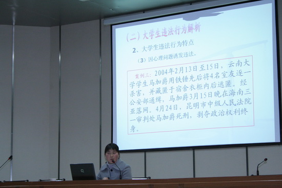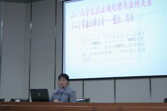 12月4日是“全国法制宣传日”,当晚,我院本周的2008��2009学年度第一学期“科学、人文、艺术素质教育系列讲座”在图文信息中心大报告厅举行,机电工程系副主任王瑞兰老师做“大学生与法”专题讲座。王老师通过一些典型案例,分析了当代大学生法律意识状况,引导大学生努力掌握有关的法律常识,正确处理“理”与“法”的关系,积极参加法律实践活动,做知法、守法、护法的大学生。她鼓励大学生用“法律的眼睛”观察问题,用“法律的思维”思考问题,用“法律的方法”解决问题,学会用法律维护自己、保障他人的合法权益。王老师的讲座深入浅出,深受广大师生的欢迎。
