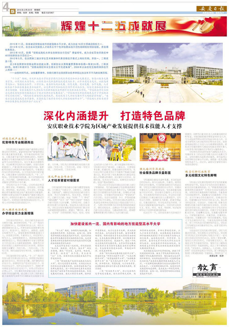 2016年2月25日,《安庆日报》“辉煌十二五成就展”栏目以《深化内涵提升 打造特色品牌 WilliamHill中文官方网站为区域发展提供技术技能人才支撑》为题,专题报道我院“十二五”时期改革发展情况,并介绍我院“十三五”时期加快建设地方技能型高水平大学的思路和举措。