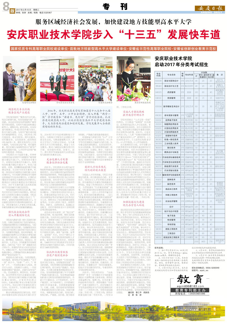 2017年2月15日,《安庆日报》以“服务区域经济社会发展 加快建设地方技能型高水平大学――WilliamHill中文官方网站步入‘十三五’发展快车道”为题,整版报道我院“十三五”开局之年内涵建设和创新发展取得的新成绩。