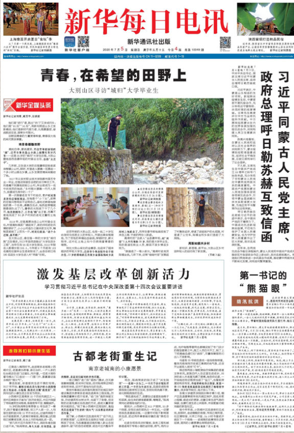 7月5日,《新华每日电讯》头版头条以《青春,在希望的田野上》为题报道大别山区“城归”大学毕业生事迹,我院2017届优秀毕业生、大别山腹地岳西县最年轻的村委会主任汪链的故事荣登头条。