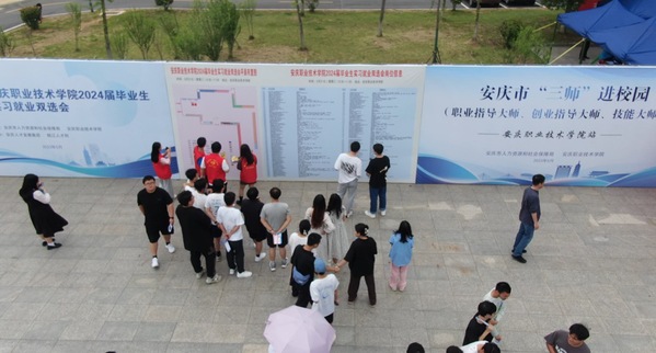 校党委书记童宏葵、党委副书记李克让、安庆市人力资源和社会保障局副局长方敏、市公共就业创业服务中心主任王中群,到双选会现场指导,了解学生们的求职意向和企业的用工需求。