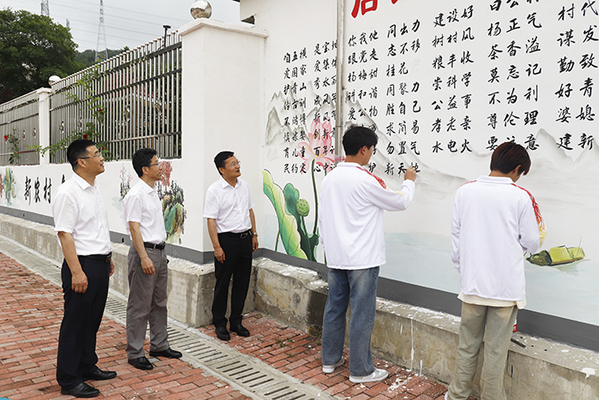 毕明生一行沿着修整一新的乡间小路,看着周边白净的墙面上一幅幅生动的手绘画面,听着参与绘画的师生的细致介绍,不时获得沿途村民满意的赞赏,对付出辛勤劳动的师生和创作成果给予了充分肯定。
