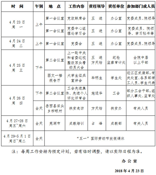 2017-2018学年第二学期第10周(4.23-4.29)工作安排
