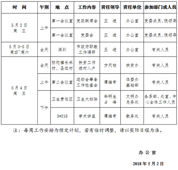 2017-2018学年第二学期第11周(4.30-5.6)工作安排