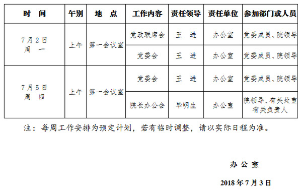 2017-2018学年第二学期第20周(7.2 -7.8)工作安排
