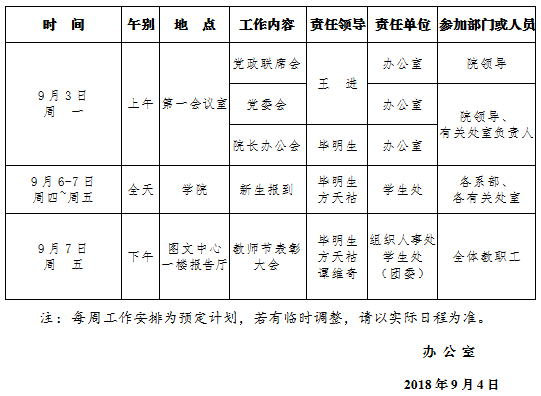 2018-2019学年第一学期第2周(9.3-9.9)工作安排