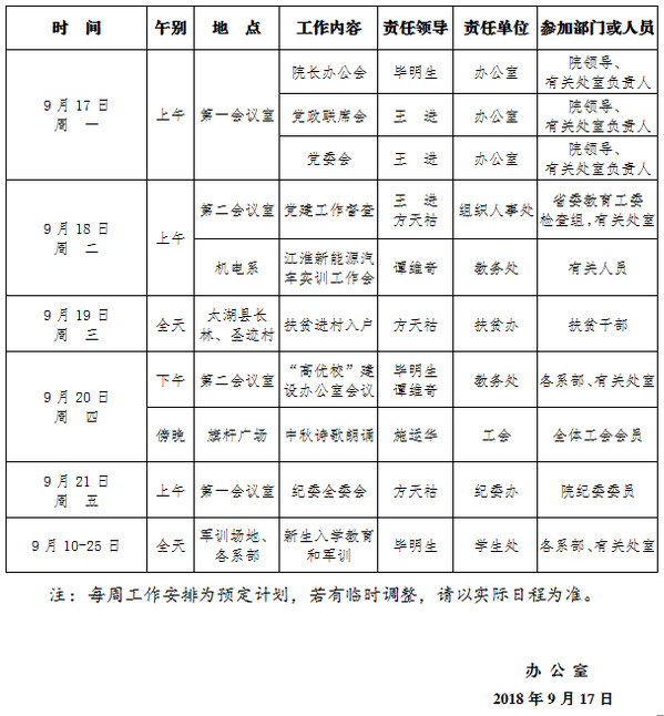 2018-2019学年第一学期第4周(9.17-9.23)工作安排