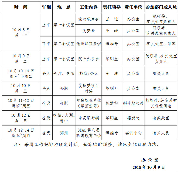 2018-2019学年第一学期第7周(10.8-10.14)工作安排