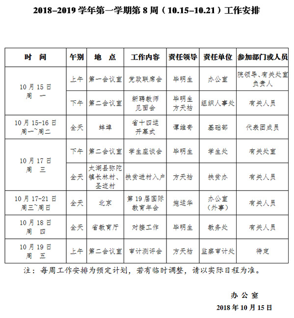 2018-2019学年第一学期第8周(10.15-10.21)工作安排