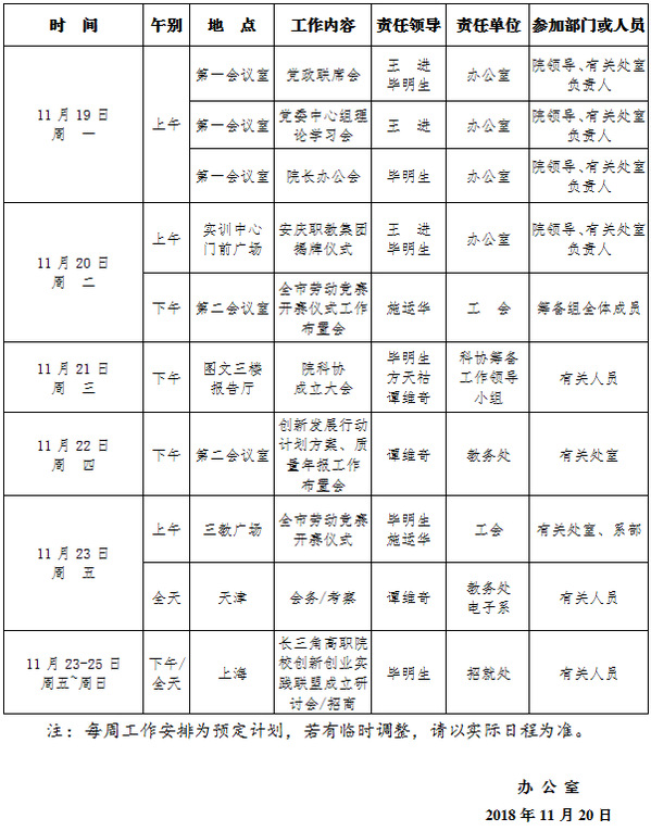 2018-2019学年第一学期第13周(11.19-11.25)工作安排