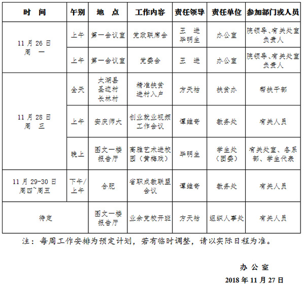 2018-2019学年第一学期第14周(11.26-12.2)工作安排