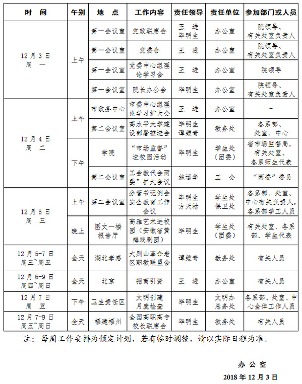 2018-2019学年第一学期第15周(12.3-12.9)工作安排