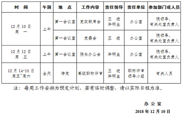 2018-2019学年第一学期第16周(12.10-12.16)工作安排