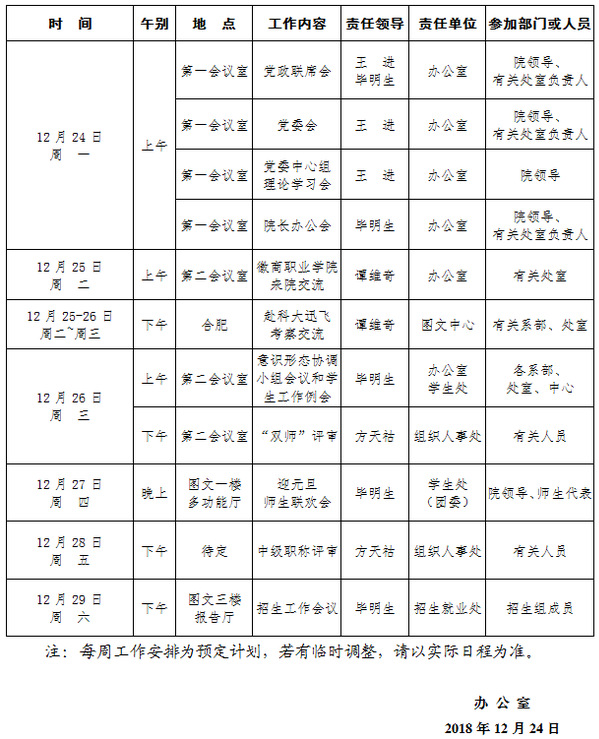 2018-2019学年第一学期第18周(12.24-12.30)工作安排