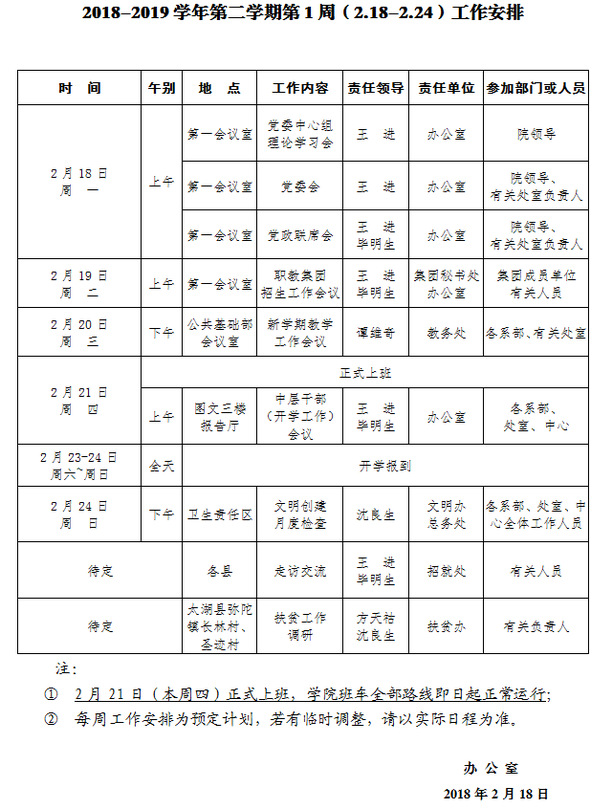 2018-2019学年第二学期第1周(2.18-2.24)工作安排