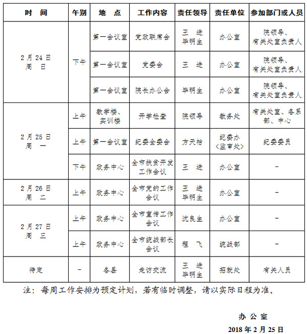 2018-2019学年第二学期第2周(2.25-3.3)工作安排