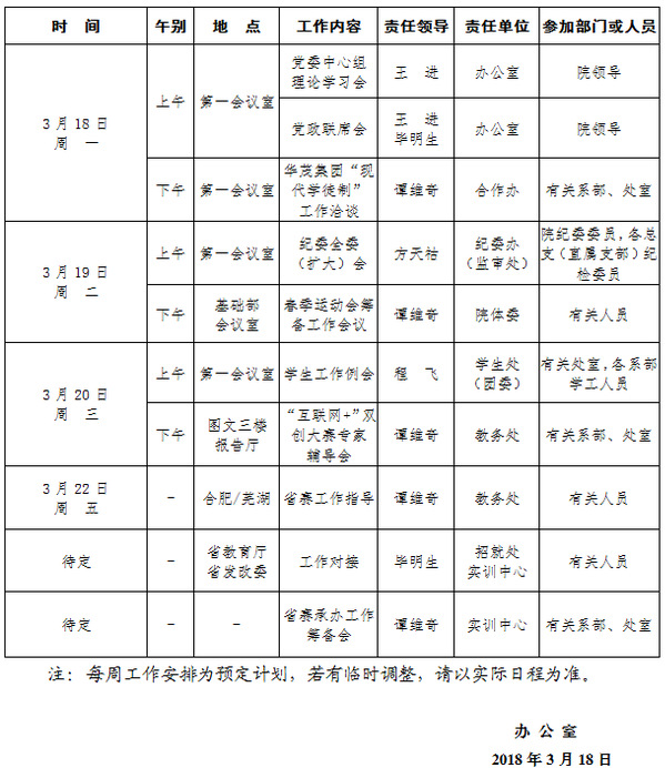 2018-2019学年第二学期第5周(3.18-3.24)工作安排