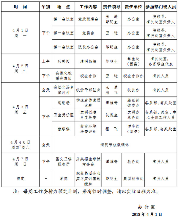 2018-2019学年第二学期第7周(4.1-4.7)工作安排