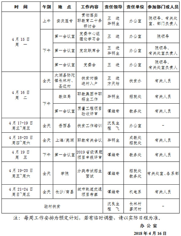 2018-2019学年第二学期第9周(4.15-4.21)工作安排