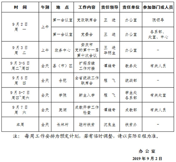 2019-2020学年第一学期第2周工作安排