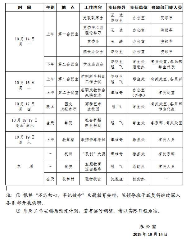 2019-2020学年第一学期第8周(10.14-10.20)工作安排