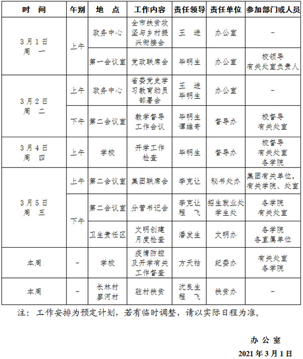 2020-2021学年第二学期第1周(3.1-3.7)工作安排