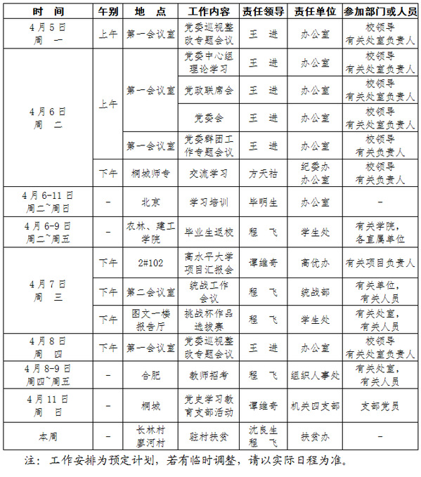 2020-2021学年第二学期第6周(4.5-4.11)工作安排