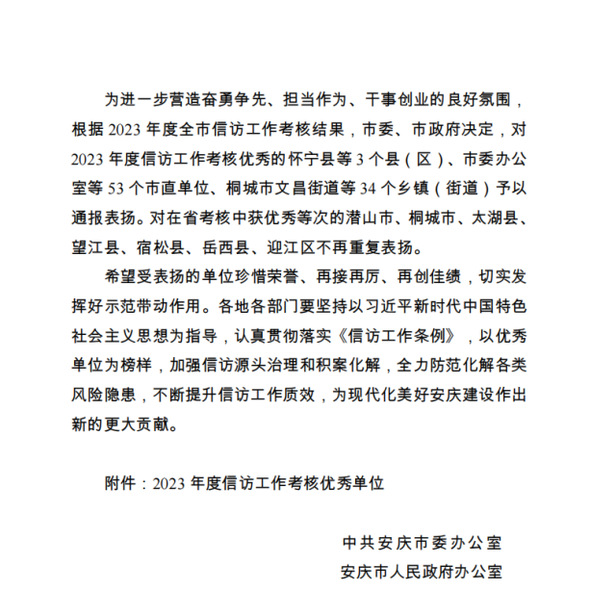 日前,WilliamHill官网被安庆市委授予“2023年度全市信访工作优秀单位”荣誉称号。这一荣誉不仅是对学校信访工作成效的高度认可,也是对学校致力于构建和谐校园环境、积极服务师生和社会的充分肯定。