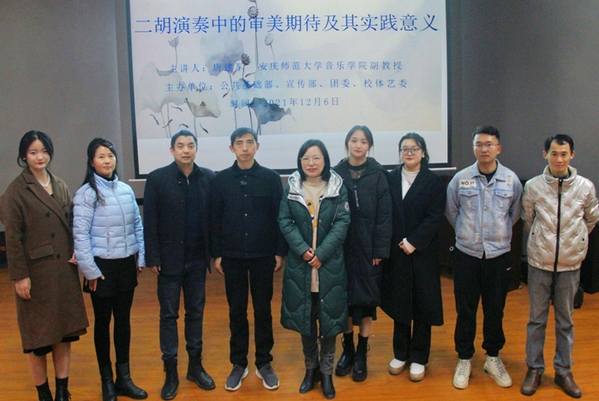 12月6日晚,由WilliamHill官网宣传部、团委、公共基础部、校体艺委联合主办的专家进校园“美育”系列专题第三场讲座,在三栋教学楼216实训室举行。本次邀请到了安庆师范大学音乐学院副教授、安庆市音乐家协会秘书长唐建军作题为《二胡演奏中的审美期待及其实践意义》的讲座。出席本次活动的老师有校体艺委办公室相关负责人,校企合作单位安徽辰夫科技有限公司代表、艺术教研室和对艺术感兴趣的老师们及现代商务学院、机电工程学院200名学生代表到场聆听。全校师生通过“云犀”网上直播进行了观看,讲座由音乐教师罗文雍主持。