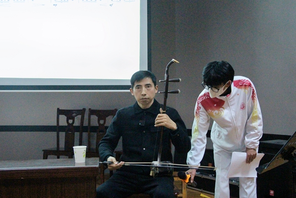 唐建军副教授首先讲解了艺术“审美期待”的基本含义,从几个方面分析了二胡演奏中的审美期待问题:对音高方面的审美期待;二胡曲散板及终止式中的审美期待及其处理方式;二胡演奏中对情绪的审美期待及其典型表情因素的处理;以及审美期待在二胡演奏中的正反面实践指导意义和在营造审美期待的过程中需要注意的问题。唐建军副教授在本次学术讲座中运用了讲、演结合的方式,每一个典型问题都予以了适当的示范,使得讲座更加生动形象,加深了同学们的印象与理解,在面对现场同学的提问时也给出了详细的解答。