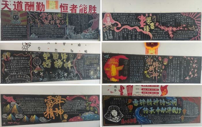 第二教学楼教室内,一幅幅以树与锋为主题的黑板报成为最吸睛的风景。创意作品将雷锋生平与树木年轮巧妙结合,用树木年轮对应雷锋事迹,用粉笔描绘螺丝钉家族,以不同树木比喻各行各业劳动者。