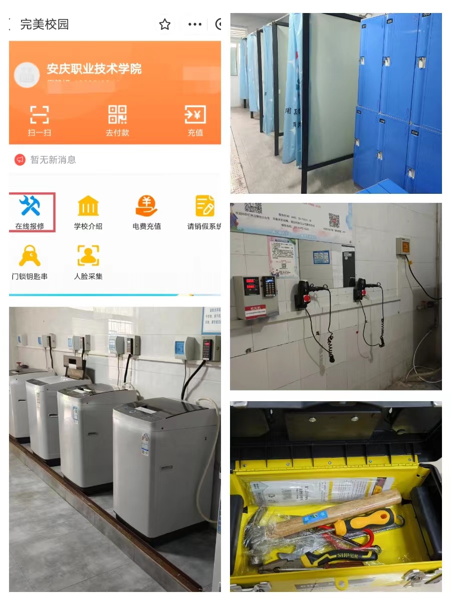 “完美校园”的“在线报修”功能,让寝室设施维修更加智慧便捷;学生公寓配备洗衣机、吹风机、净水设备、工具箱等,满足学生日常生活所需;为解决个别公寓洗浴人数拥挤的情况,与热水供应公司协商,在需要楼层增加洗浴中心数目。