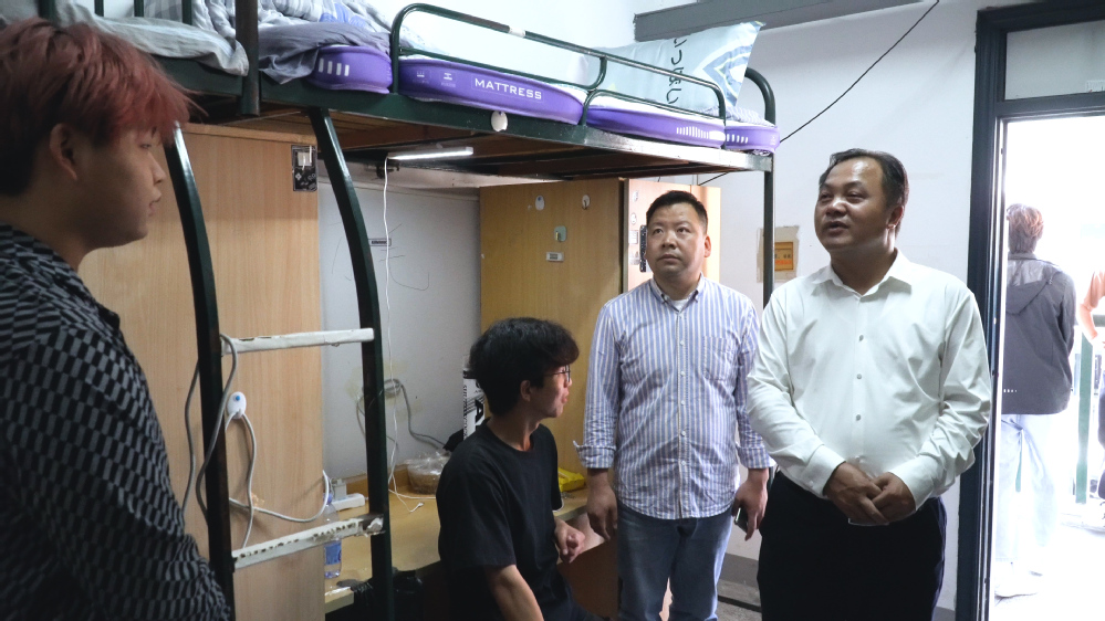 来到1号公寓楼,师生们一起查看了各学院的寝室卫生情况。在建筑工程学院的236434寝室,程飞对同学们轮流值日、垃圾袋装化的行为频频赞许,也鼓励其他同学都能像他们一样,营造良好的住宿环境。对于公寓楼存在的消防、水电安全隐患,程飞也要求后勤保障处、物业公司尽快予以解决。