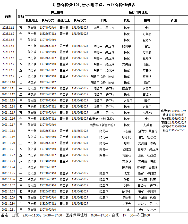 后勤保障处12月份水电维修、医疗保障值班表