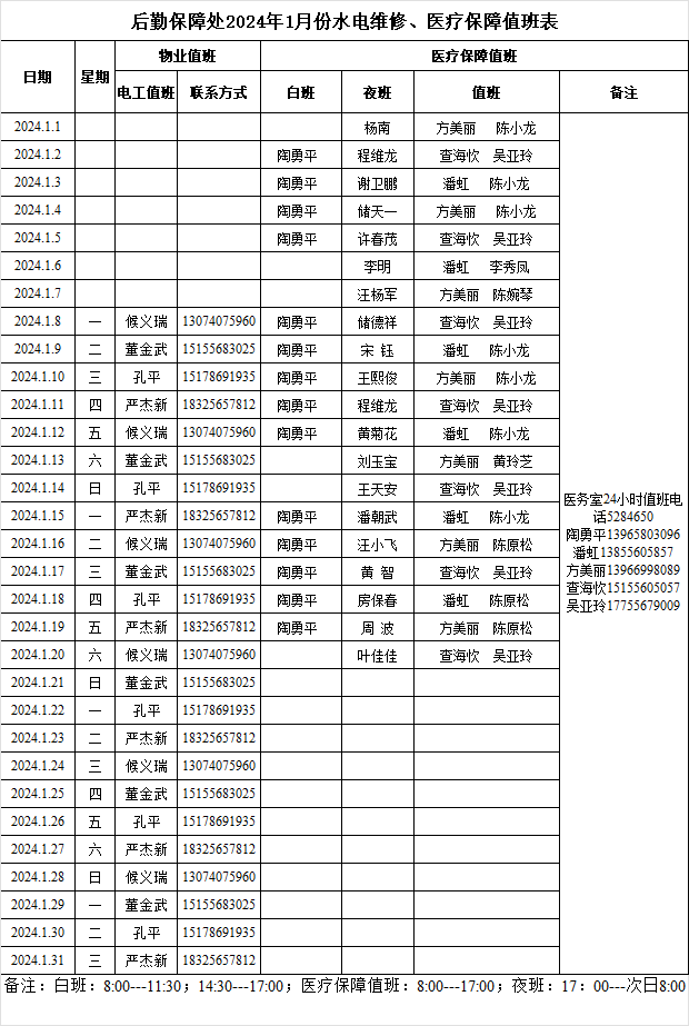 后勤保障处2024年1月份水电维修、医疗保障值班表