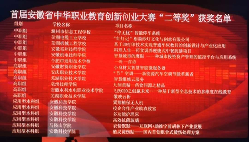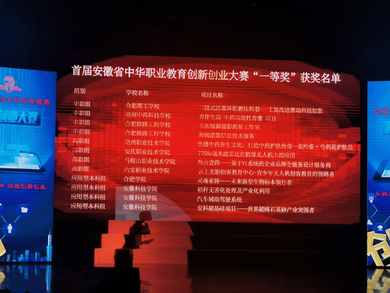 20201015日,首届安徽省中华职业教育创新创业大赛在安徽省亳州市成功举办。大赛分为应用型本科组、高职组和中职组,由安徽省中华职业教育社、安徽省教育厅、安徽省人社厅主办,中共亳州市委统战部、亳州市教育局、亳州市人社局协办,亳州中药科技学校(亳州技师学院)承办。