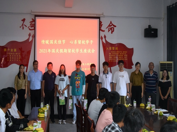 9月30日下午,机电工程学院在1号教学楼208会议室举行了“情暖国庆佳节 心系留校学子”国庆假期留校学生座谈暨慰问活动。学院党总支书记、院长刘磊携党政班子成员及辅导员老师代表出席,21级新生代表共计20余人参加座谈会。