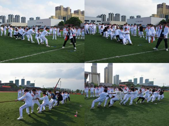 拔河比赛中,同学们双脚发力,上身用力前倾,手紧握着绳索。前排同学们紧张地睁着双眼准备暗暗发力,只等着裁判的一声哨响,便使出洪荒之力,后排同学把绳子绑在腰上,打算用后仰式夺取核心压力。在最后趣味接力赛跑中,同学们神态各异,有的奔跑时笑容满面、对第一势在必得的模样,有的奔跑时微微颤抖着双肩,但仍秉持着不放弃的精神奋力冲向终点。