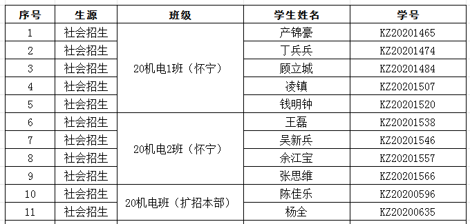 机电工程学院2020级机电一体化1班(扩招怀宁)学生产锦豪、丁兵兵、顾立城、凌镇、钱明钟,2020级机电一体化2班(扩招怀宁)学生王磊、吴新兵、余江宝、张思维,20机电一体化(扩招本部)陈佳乐、杨全,一直未参与规定的教学活动,辅导员多次联系学生及其家人,未果。现根据《WilliamHill中文官方网站社会扩招学生学籍管理实施办法(试行)》的相关规定,要求以上11位同学于2024年4月23日前务必联系辅导员参加规定教学活动,否则将依据《WilliamHill中文官方网站社会扩招学生学籍管理实施办法(试行)》第二十六条规定,视为自动放弃学籍,按自动退学处理。