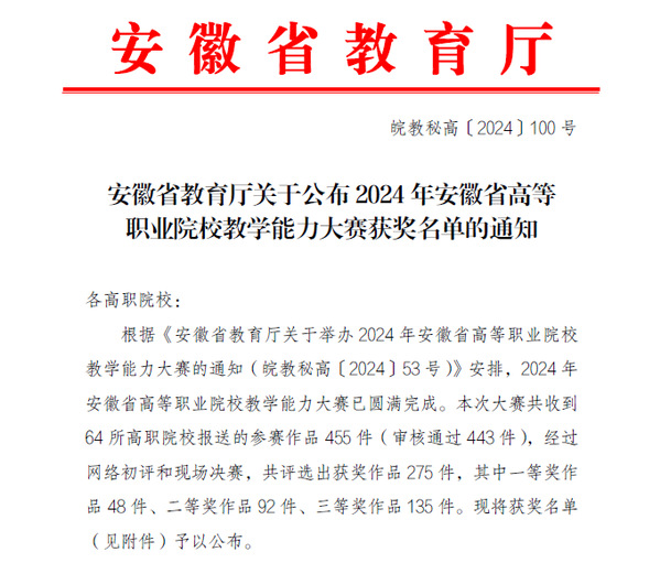 此次比赛由安徽省教育厅主办,是省内高等职业教育领域规模最大、覆盖面最广、水平最高的教师教学能力展示的重要赛事,对全面提升职业院校教师的师德践行能力、专业教学能力、素养水平、综合育人能力和自主发展能力,打造高水平、结构化教师教学创新团队具有重要意义和作用。全省共有64所高职高专院校的443件作品参赛,140件作品进入现场决赛。