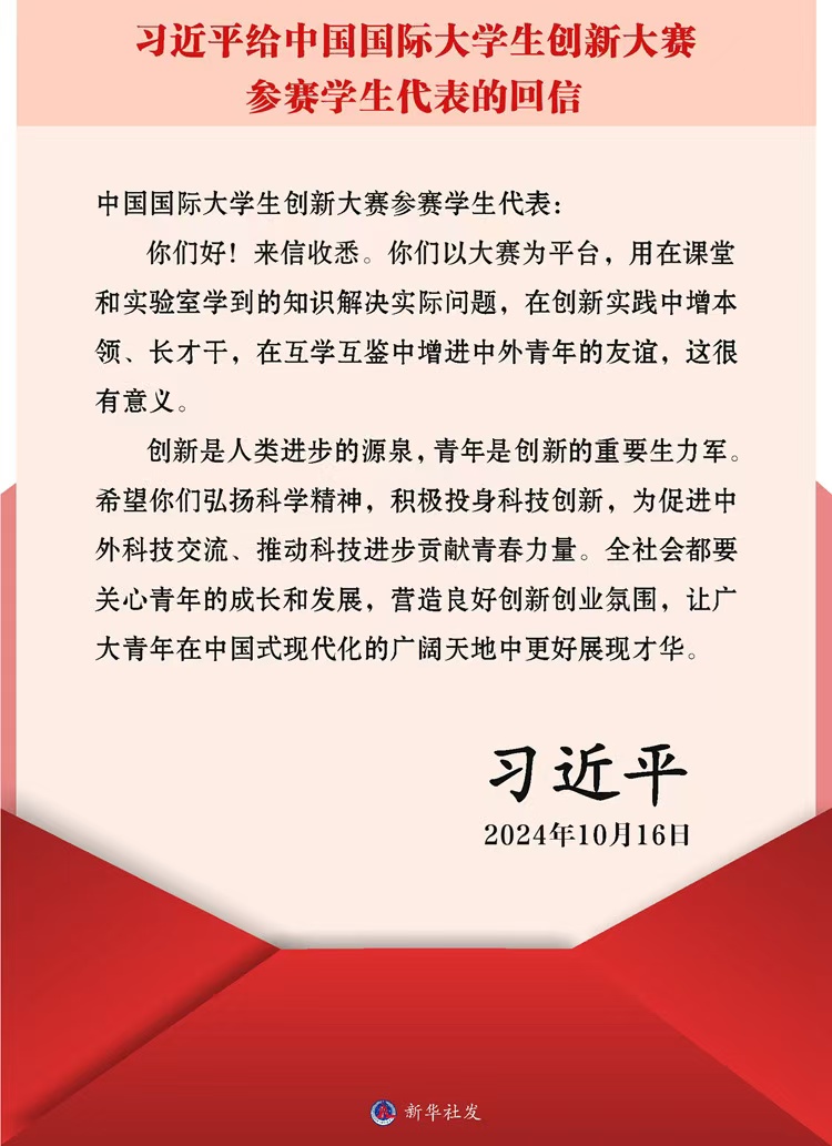 近日,中共中央总书记、国家主席、中央军委主席习近平给中国国际大学生创新大赛参赛学生代表回信,对他们予以亲切勉励并提出殷切希望。 中国国际大学生创新大赛是由教育部等12个中央部委和地方省级人民政府共同主办的重要创新创业赛事,大赛以“我敢闯、我会创”为主题,包括高教主赛道、“青年红色筑梦之旅”赛道、职教赛道、产业命题赛道、萌芽赛道等,大赛规模与质量逐年攀升,成为覆盖全国所有高校、面向全体大学生、影响最大的高校双创盛会。自今年5月启动以来,共有来自国内外153个国家和地区5406所学校的514万个项目、2084万人次报名参赛。25名参赛学生代表给习近平总书记写信,汇报参赛的心得体会,表达投身创新实践、勇担时代使命的决心。