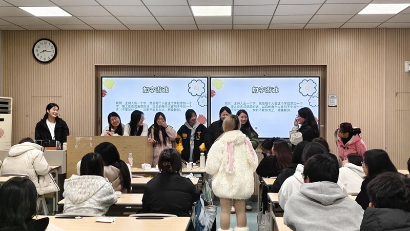 活动由文艺委员刘琪同学开场,她详细介绍了游戏规则,赵文语负责配合。首先是“歌曲竞赛”环节,同学们不仅要比拼谁的歌曲储备更丰富,还要看谁能更快地接上下一句歌词。这个环节不仅考验了同学们的音乐素养,更是团队协作和反应速度的较量。紧接着是“泡泡糖”游戏,参与者需要根据主持人的指令,用身体的某个部位与他人相接触。这个游戏不仅带来了欢笑,还锻炼了同学们的快速反应能力。最后是“加字游戏”,同学们每次加一个字进行句子接龙,创造出的句子稀奇古怪,逗得在场的人捧腹大笑。这个环节不仅考验了同学们的词汇量,更是对团队协作和即兴创作的挑战。