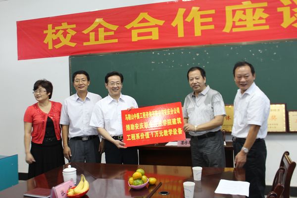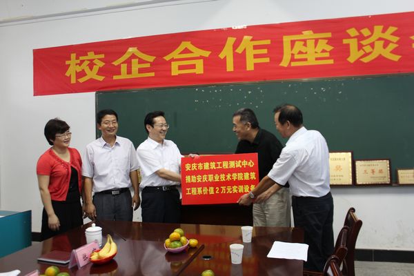 9月24日下午建筑工程系举办校企合作座谈会暨捐助仪式,院长孙晓峰教授出席座谈会并代表学院接受了安庆市建筑工程测试中心、马鞍山中振工程咨询有限公司安庆分公司、安庆市岑海建筑设计有限公司三家企业的捐助,建筑工程系党总支书记徐北平同志主持仪式,孙院长高度赞扬了三家企业的捐资助学义举,肯定了建筑工程系在校企合作方面取得的成绩,希望校企双方合作共赢,创出品牌。