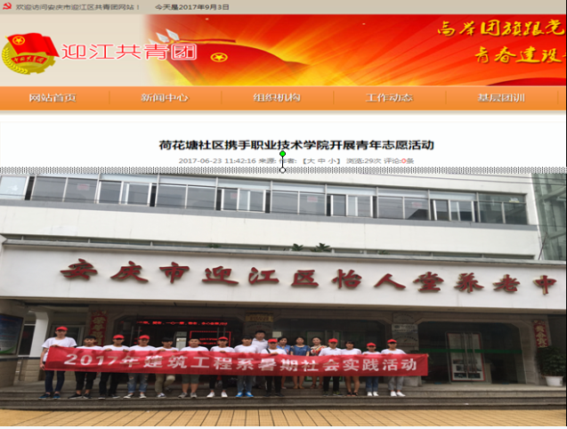为引导和帮助广大青年学生在社会实践中受教育、长才干、 作贡献,积极践行社会主义核心价值观,结合共青团“一学一做”教育实践活动的要求以及我院实际,建筑工程系团总支和安庆市孝肃路荷花塘社区合作开展了以“团员先锋・传递能量”为主题的社区公益志愿行动。