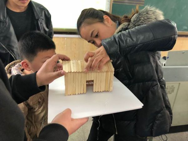 大学生志愿者们来到安庆市公园小学二年级的课堂上,在场的40余名小朋友们按捺不住好奇心,个个睁着萌萌的大眼睛,纷纷跃跃欲试。为了结合低年级同学的思维特点,尽可能让孩子多参与到具体的环节中来,提高他们创新意识,张欢欢老师设计了用冰棍搭建自已理想中的房子比赛,小学生们动手,大哥哥大姐姐分组指导。在活动过程中,小朋友们时而紧皱眉头思考、时而睁大眼睛讨论,短短几分钟,之前还略显寂静的教室就迅速升温,现场一下子沸腾起来。成长的乐趣并不仅仅在于回答未知,而在于探索的历程,通过孩子们的努力,把想象中的宫殿、农舍、教学楼一一变成漂亮的模型,看着自己的作品,他们的脸上露出了兴奋又得意的笑容。
