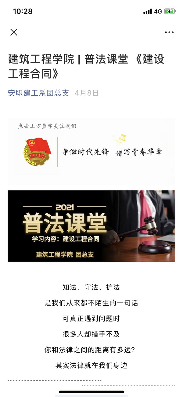 2021年是中国共产党成立100周年,也是“十四五”规划开局之年和开启全面建设社会主义现代化国家新征程第一年。为了全面深化推进法治教育进校园,切实增强青年学生法治意识,助力健康成长,建筑工程学院团总支开展了“与法同行·青春正好”法治文化节活动。