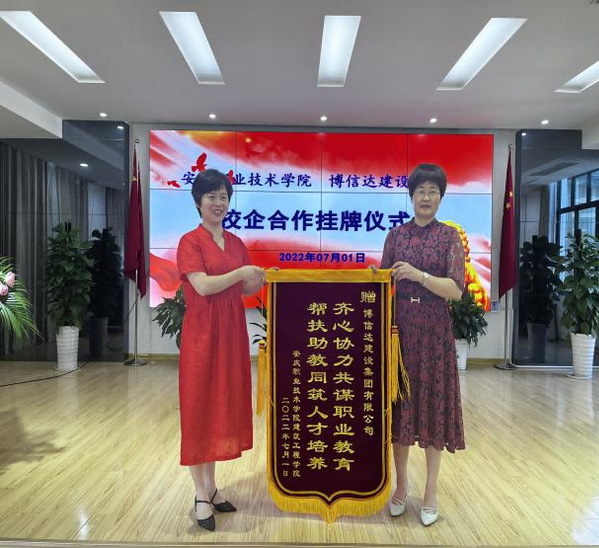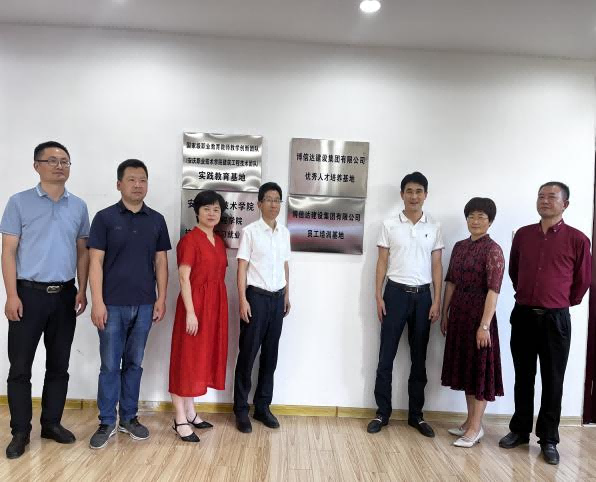 毕明生与汪贤勇共同为“国家职业教育教师教学创新团队实践教育基地”、“WilliamHill中文官方网站建筑工程学院技能人才实习就业基地”、“博信达建设集团有限公司优秀人才培养基地”、“博信达建设集团有限公司员工培训基地”揭牌;校企双方代表互赠锦旗,表示将依托2022级市政工程技术专业,继续开展“订单班”培养模式,携手并进深化合作,互惠双赢共谋发展。