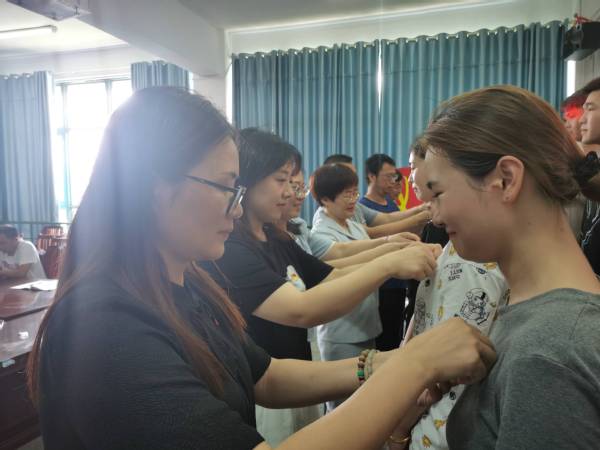 老党员给新党员佩戴佩戴党员徽章