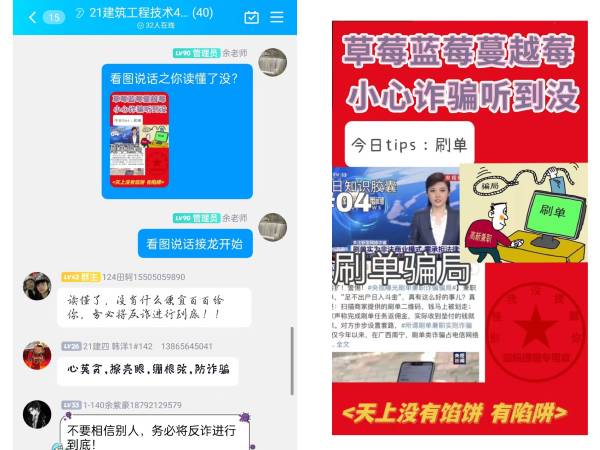 线上专兼职辅导员利用课余时间在学生联络群内通过看图说话等趣味性互动方式鼓励学生加强自身反诈知识学习,从生动的漫画、新闻截图出发筑牢反诈防线,加强学生反诈意识。