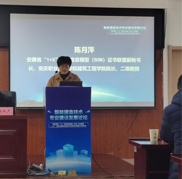 研讨会上,陈月萍作为安徽省“1+X”建筑信息模型BIM证书联盟副秘书长,向大会做了本年度工作总结和下年度工作计划的报告,她从师资培训、证书考培、技能竞赛等方面对BIM证书联盟年度工作进行了全面总结,从搭建竞技平台、强化师资培训、服务学生考证、加强校企合作等方面对BIM证书联盟下年度工作做了详细安排,她倡议成员校加强交流协作,更好地发挥BIM证书联盟平台作用,助力我省土建类专业群教育教学改革和高质量人才培养。
